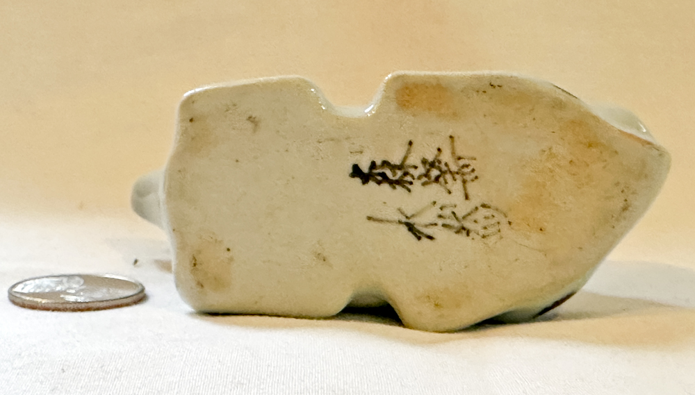 This one was sold as Korean, and I suspect that is correct. It is very different in tyle and composition from those above. The bull is really a bull, not a water buffalo, and the man is sort of sitting up and has a full hear of hair. It's quite large and heavy, about 5 1/2" long. Interestingly, it is heaily glazed on the back, but not on the front.