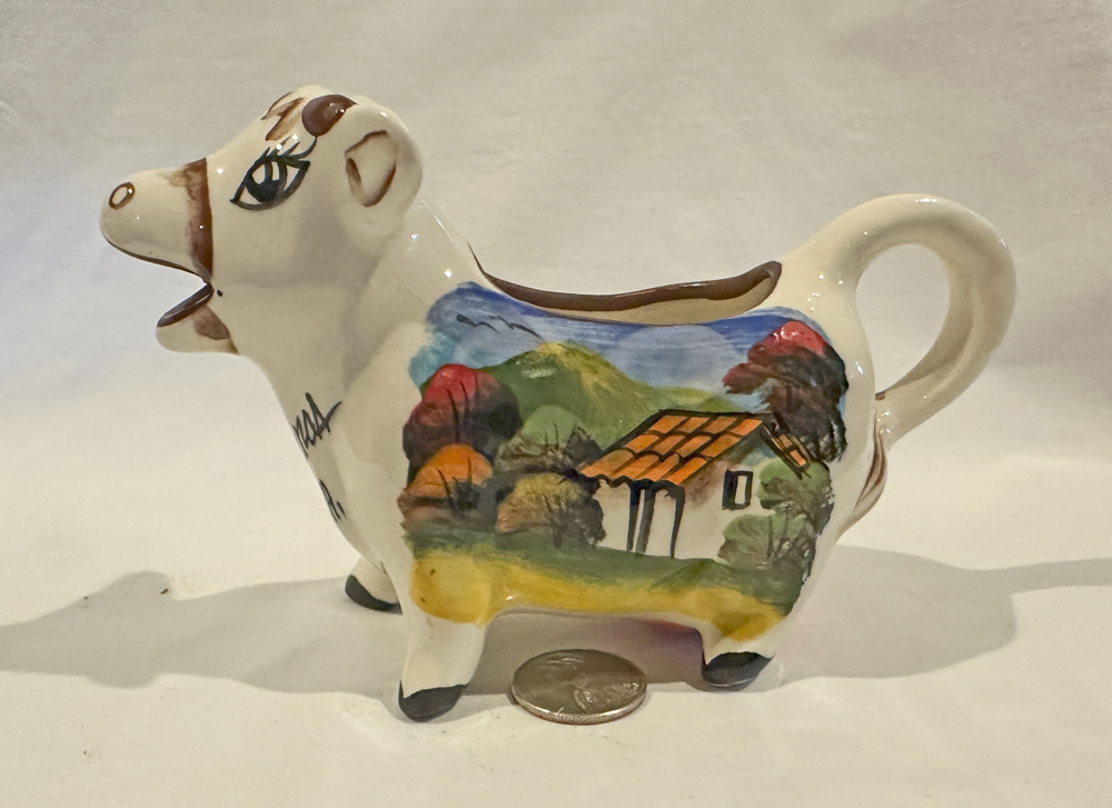 Per usual, once I make a statement like the one above I am proved wrong, if only a few years (6+ in ths case) later. So here is a real souvenir cow creamer from Japan - even if it's very tiny like the Hokkaido pitcher. It advertizes Karuizawa, a mountain resoet at the foot of an active volcano. It arrived accompanied by a tiny pig pitcher...and you can learn more about them both way down on the Miniatures page. |