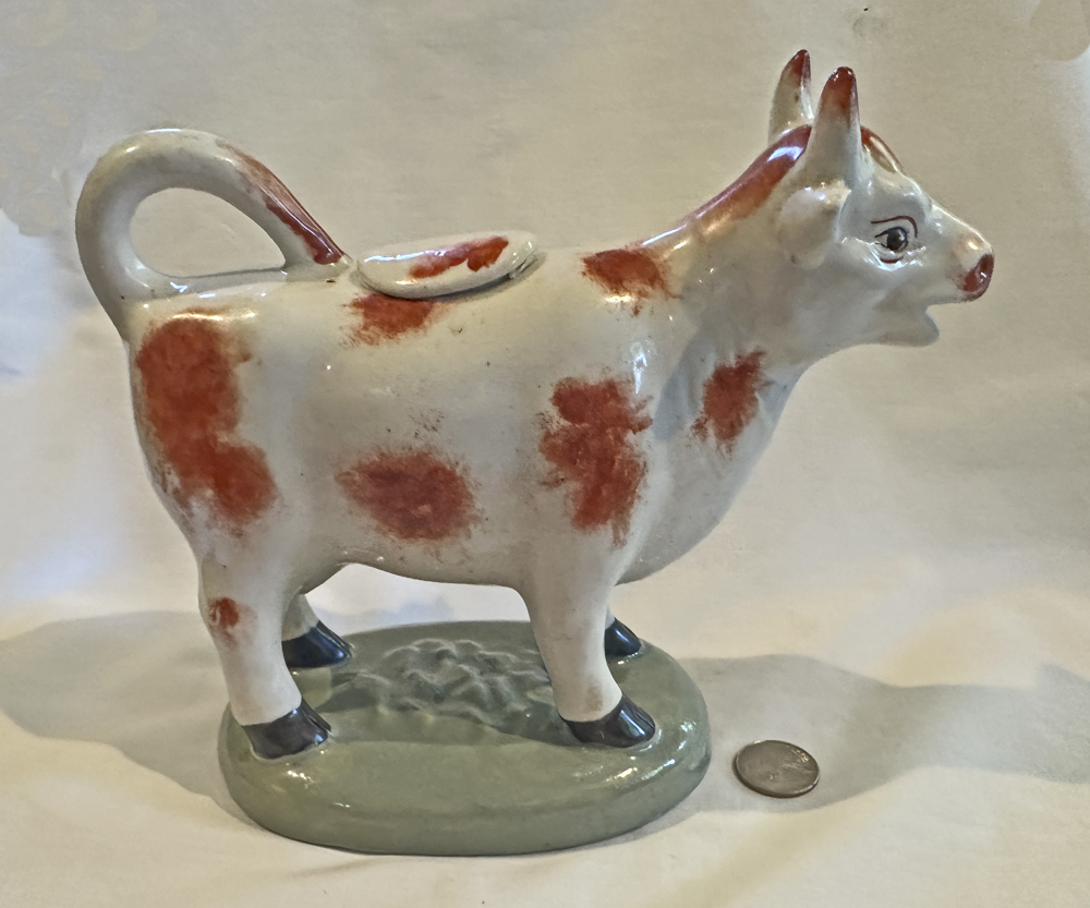 I don’t know what to make of this one, and the seller --from Ontario - could only tell me that it was old and acquired from a family selling off their aunt’s things.  Very thick, heavy, and hard ceramic, missing a lid that apparently was incised into the back (like some of the very early Staffordshire ones).  Unfortunately one of the horns got broken during shipment to me;  whatever material that it’s made of doesn’t like super glue, so the tip remains wrapped in tissue in the creamer until I can get some professional restoration.