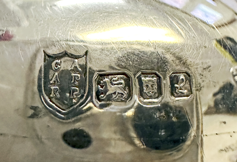 This second of my triplets, dated 1962 bears the maker’s marks HP over LP, for Herbert and Lawrence Parsons, trading as Tessiers, Ltd. It came to me from the estate of a Yale Univ. family that was originally from Ireland. A search for the makers turned up considerable information about Tessiers, on silvercollection.it: “The firm claims to have been established in 1812, possibly by the descendants of Etienne de Tessier, a Huguenot refugee who arrived in England in 1712, but the first information about the business are in an 1841 directory listing a Griffin & Tessier, goldsmiths and silversmiths, at 32 South Audley Street. One of the partners was Louis (Lewis) Alexander Tessier (c.1795-after 1861) who in 1851 advertised as Louis Tessier & Sons, active as artists in hair mourning jewellery at 32 Conduit Street and 32 South Audley Street. After the retirement of L.A. Tessier (1857) the business was continued by his sons Henry Thomas Louis Tessier (1816-1891) and Edward Tessier.The partnership, active also at 26 New Bond Street, was dissolved in 1869.H .T.L. Tessier continued the business at 32 South Audley Street while Edward Tessier maintained the business at 26 New Bond Street. Edward Tessier died in 1875 and the business was sold to John Gotlieu Vander and John Hedges who continued the activity under the name of E. Tessier and/or Vander & Hedges.After the dissolution of the partnership with Hedges (1900) Vander continued the activity under the same style until his death (1910). The business Edward Tessier/Vander & Hedges was continued by Arthur Martin Parsons (c.1859-1943) and Frank Herbert Parsons (died 1934) and in 1920 the firm was converted into a limited liability company under the style Tessiers Ltd. The first directors were A.M. Parsons, F.H. Parsons and S.F. Parsons. Herbert Martin Parsons (1892-1981), son of A.M. Parsons, succeeded his father as head of the firm. The firm is now active in a newly established store at 10 Burlington Arcade Piccadilly as dealers in antique and modern jewellery and silver.” Nothing about Lawrence, but certainly a lot of otherwise good information.