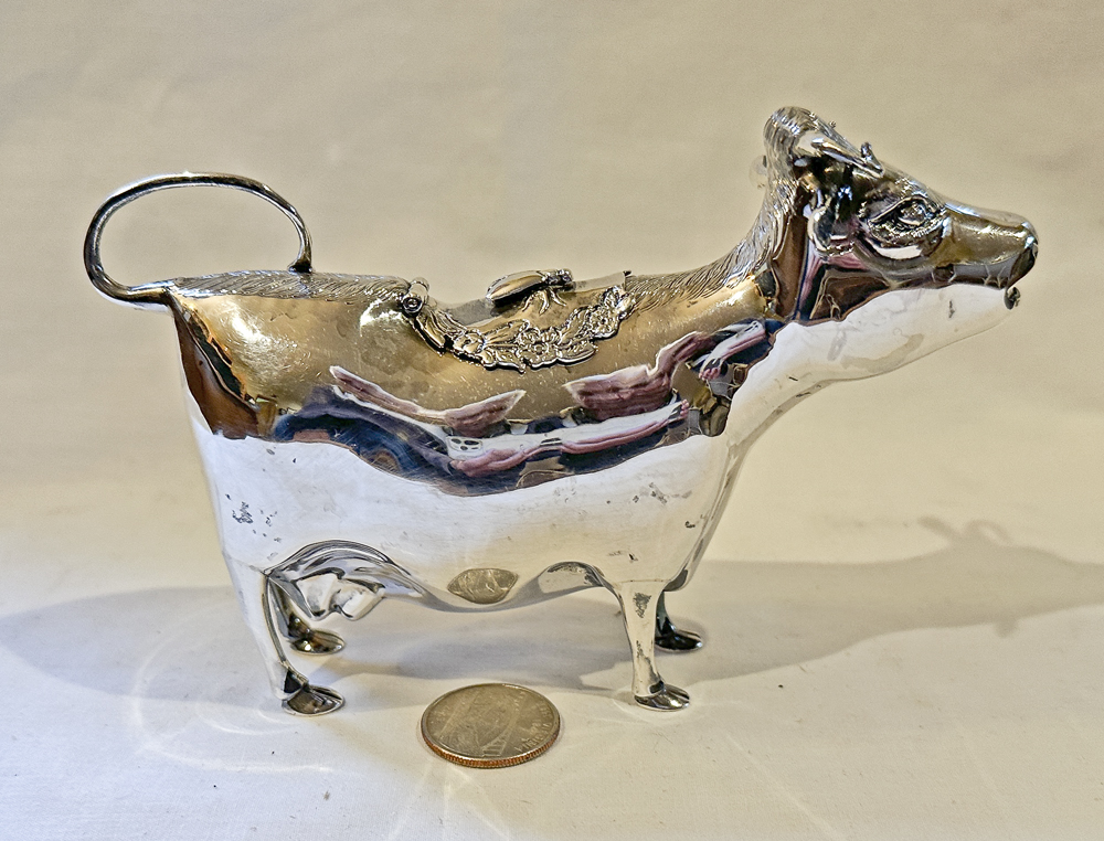 Here is a second George Richmond Collis silver-plated cow, differing from the one above only by slightly different horns and fly.  One thing that makes it interesting is that on the right flank it bears an engraved crown over “GR”.  Of course I’d like to believe that that stands for George Rex, or King George, but then again there are no numbers so even if so it’d be hard to say which one.