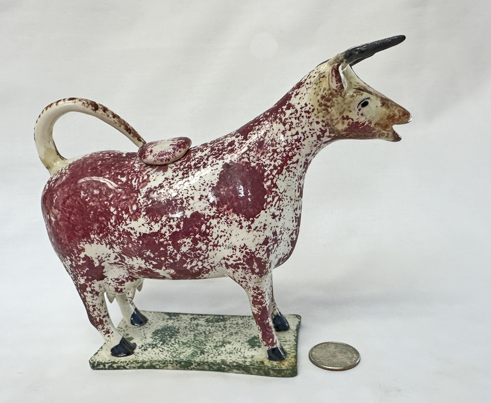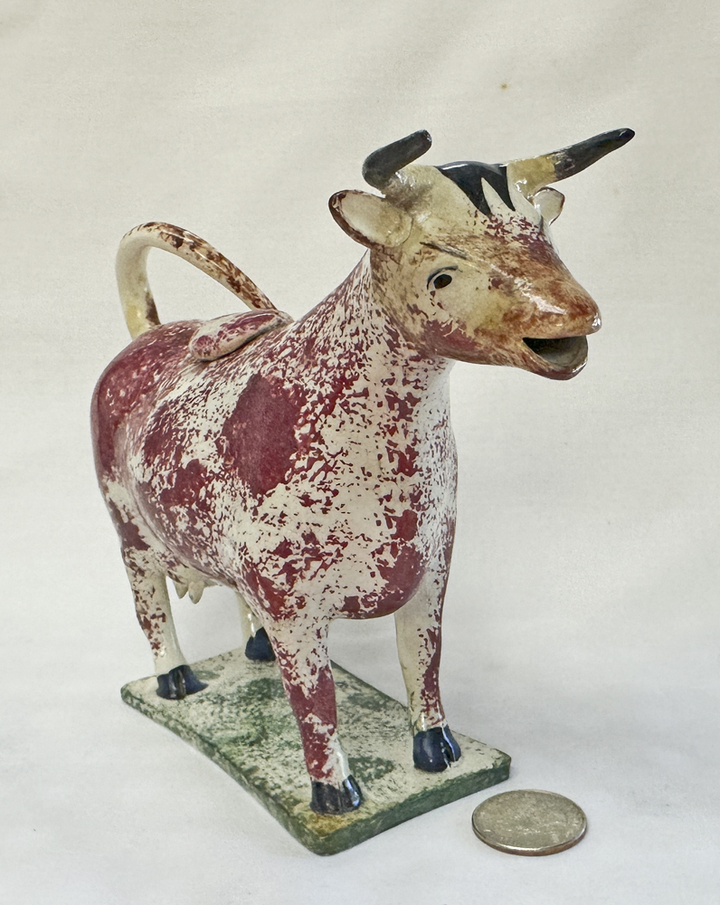 Cow creamers were, of course, only a very small component of the wares produced in Staffordshire, which had been noted for its potteries for hundreds of years. Most pieces naturally were simply utilitarian – bowls, pots, plates, etc.  Starting in the 1700s, in keeping with the overall trends of industrialization in Britain, the potteries became more mechanized and organized, and so they remain today although there has been an almost infinite number of changes in process as well as ownership and organization of the firms.   There are a number of good sources for the potteries history, but for a short version I’d suggest   http://www.historynet.com/potteries-of-staffordshire.htm .  At around the middle of the 18th century, in response to a growing demand for both quality and decoration, the potters began to complement their functional items with figures of people and animals. Not unnaturally some of these more fanciful items also were designed to serve useful purposes such as holding spills, and – after they became popular – serving milk and cream.   For a brief introduction to the art of the very popular (and still very highly sought by collectors) Staffordshire figure, try http://www.adelekenny.com/-staffordshire-figures.html. For those who want a more in-depth treatment, I can heartily recommend Pat Halfpenny’s excellent book, "English Earthenware Figures, 1740-1840", published by the Antique Collector’s Club and available through a number of used book sellers both in the UK and the US.